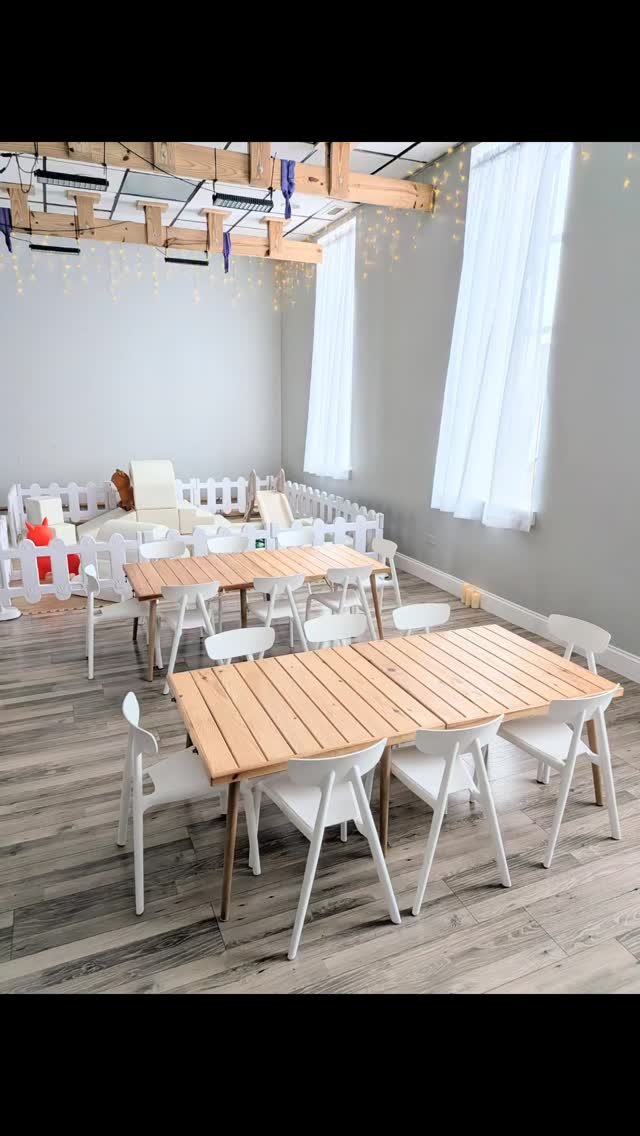 Take the ‘kids table’ up a notch with our wood tables and colorful chairs. Add on our table styling services for a stress free and adorable dining area!