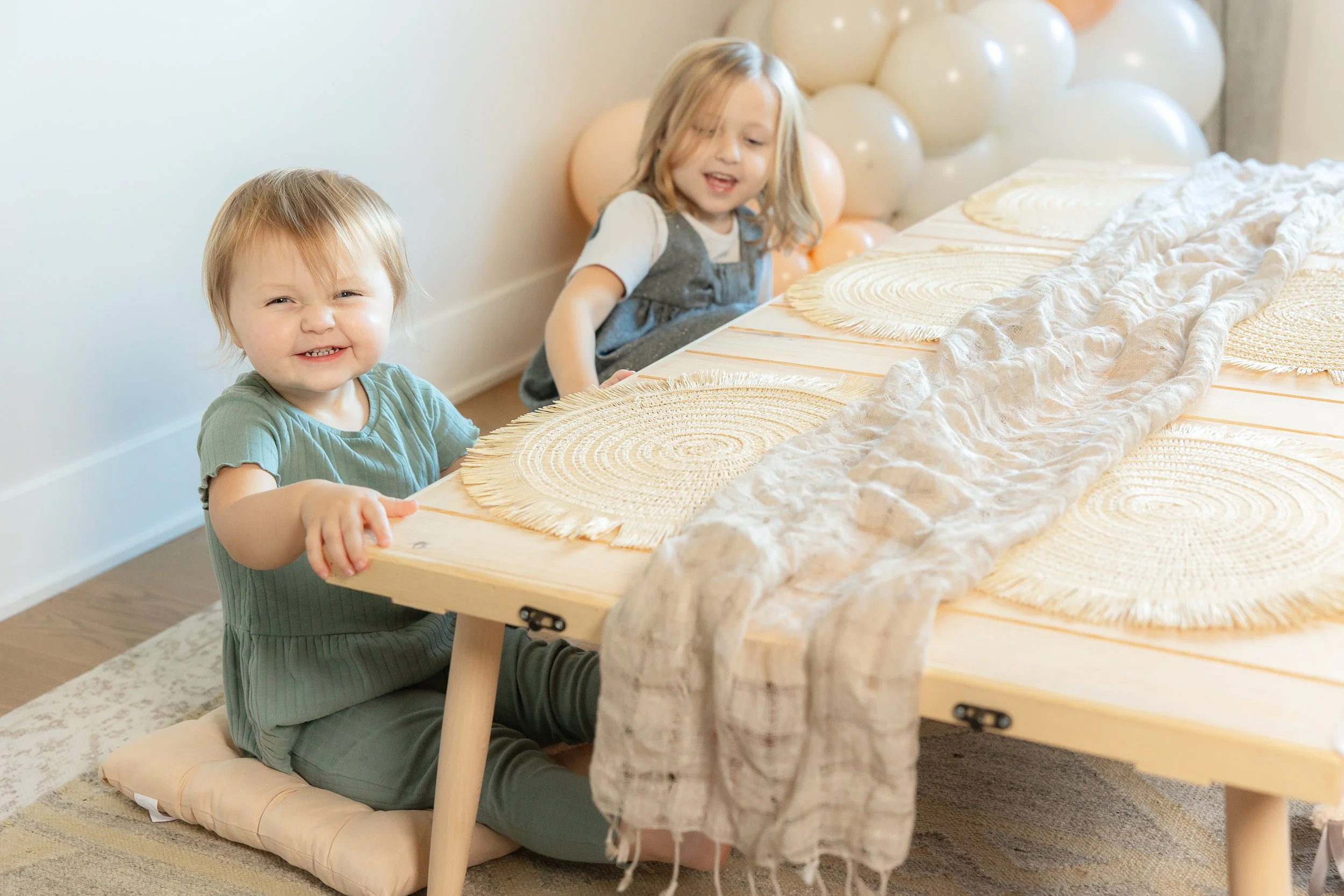 Our wood tables can be used at picnic height with floor cushions, or kids table height with colorful chairs.